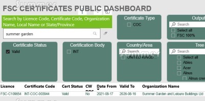 • To verify our FSC membership visit the FSC Member Search and search for Summer Garden (full name "Summer Garden and Leisure Buildings Ltd"). Our FSC licence number is FSC-C109654 and our FSC chain of custody certificate code is INT-COC-003944.