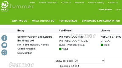 • To verify our PEFC membership visit the PEFC Find Certified and search for Summer Garden (full name "Summer Garden and Leisure Buildings Ltd"). Our PEFC certificate number is INT-PEFC-COC-1119. Our PEFC licence number is PEFC/16-37-2190.