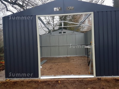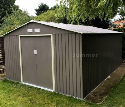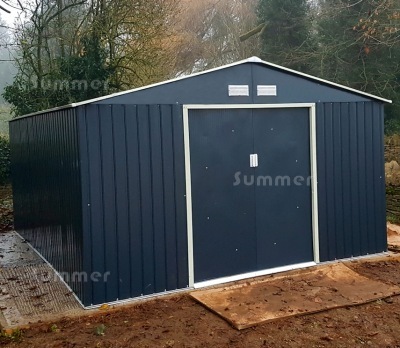 These great value metal sheds are approximately 11'x10', 11'x12' or 11'x15' with an attractive grey coloured external finish. Heavier than most other comparable metal sheds, all framing and cladding is hot dip galvanized steel. The cladding and doors are also resin coated on both sides. Large sliding double doors in the 11' wide wall are included with lockable handles and a heavy duty threshold. Strong foundation rails are also included. The strong roof structure features 4" thick rafters and ventilated gables. All fixings and instructions are included. Options include a unique choice of base options and a selection of base anchor fixings to ensure that your shed is fixed down securely. Accessories include shelves, tool racks and tool hooks.